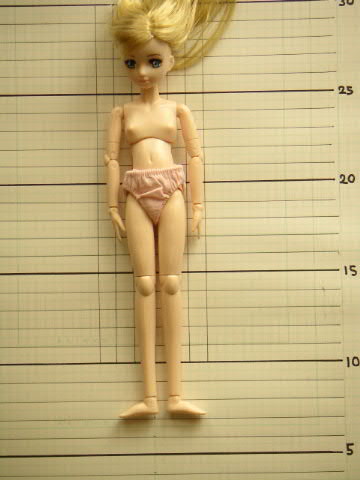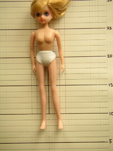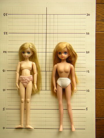 オビツ23cm女性ホワイティとリカちゃんボディ(顔はリペントしてあります)の比較写真です。