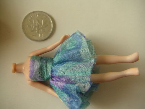 ピンクの布はキャミソールのすその方、金色のはリボン、えび茶もリボン。あまりの小ささに脱ぎ着できる服にするのはあきらめて、身ごろは糸で綴じ付けました。スカートはゴム入りなので、着脱可能。