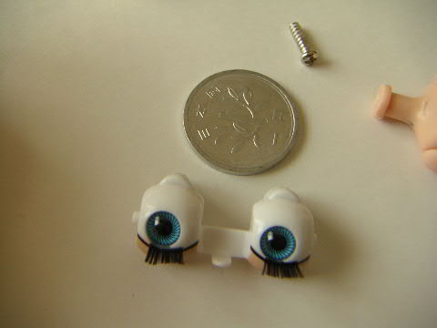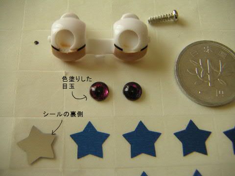 人形の目のパーツをはずして、瞳の色を変え、睫毛をつけました。